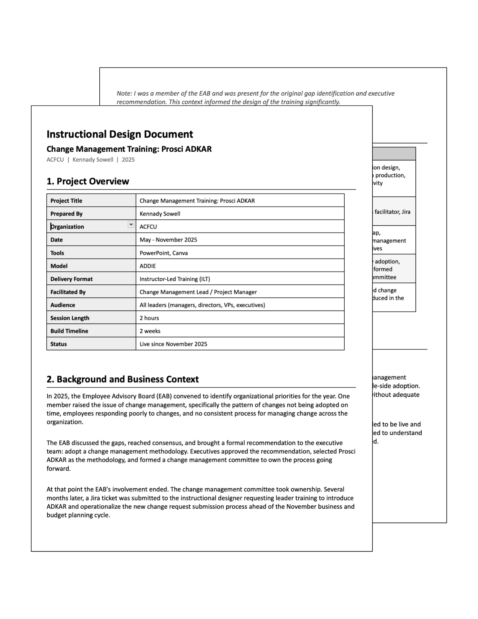 The Employee Advisory Board identified a pattern across the organization: changes weren't being adopted on time, employees weren't responding well to them, and there was no consistent process for managing change at all. The EAB brought the gap to leadership with a formal recommendation to adopt a change management methodology. Executives approved it, chose Prosci ADKAR, and formed a change management committee. The diagnosis happened before anyone was ever asked to build training.